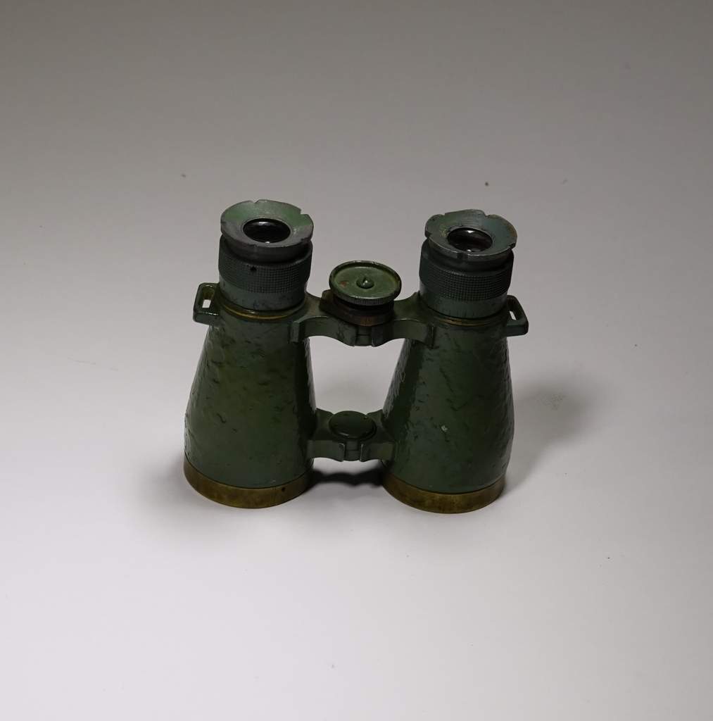 A pair of green metal field glasses.